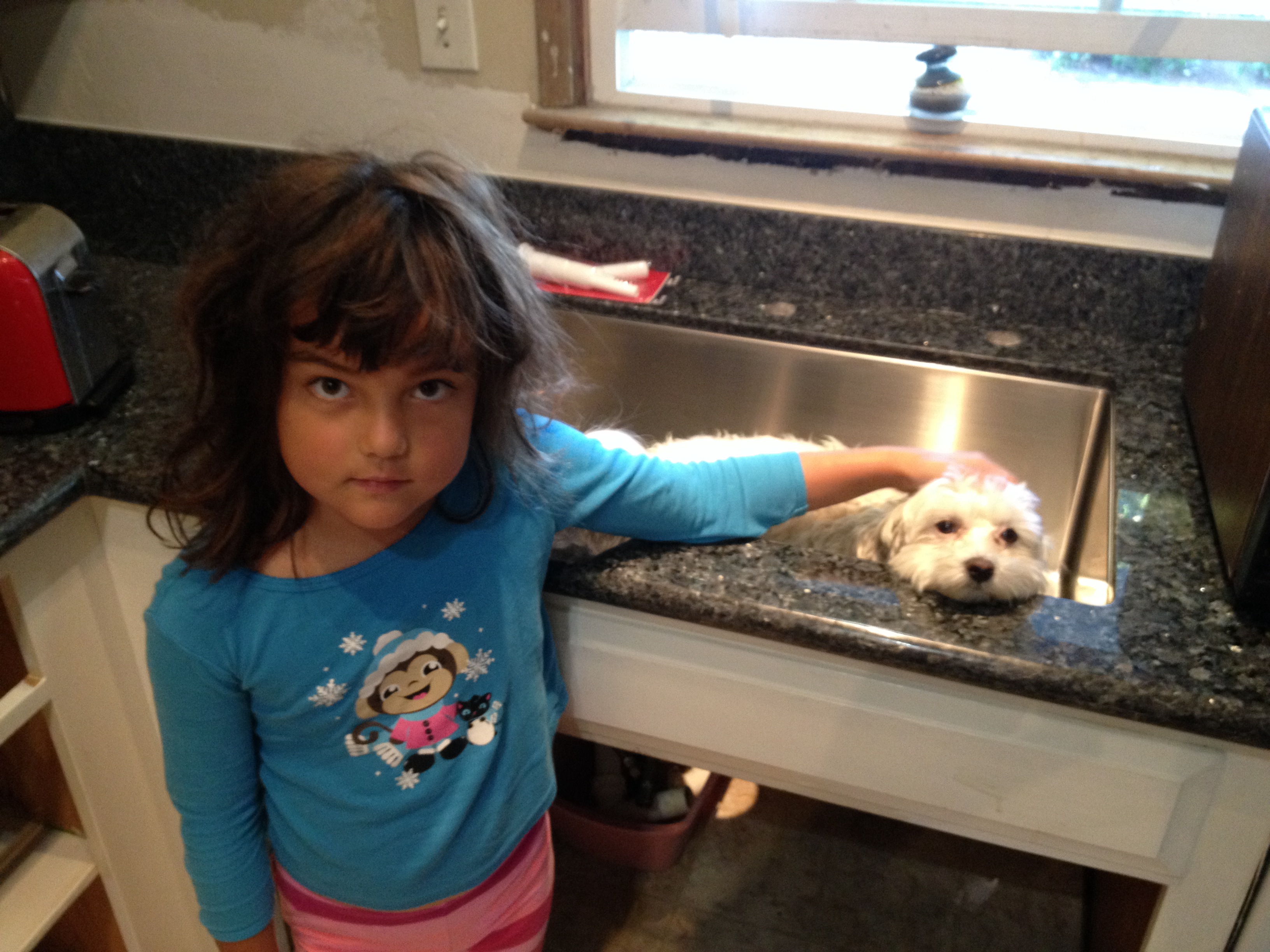 Happiness is a new kitchen. We’re in the process of remodeling our kitchen. New paint on the cabinets, granite countertops, new sink…Now our poor, water-averse dog now has a sink big enough to bathe in. Think he’s starting to figure that out?